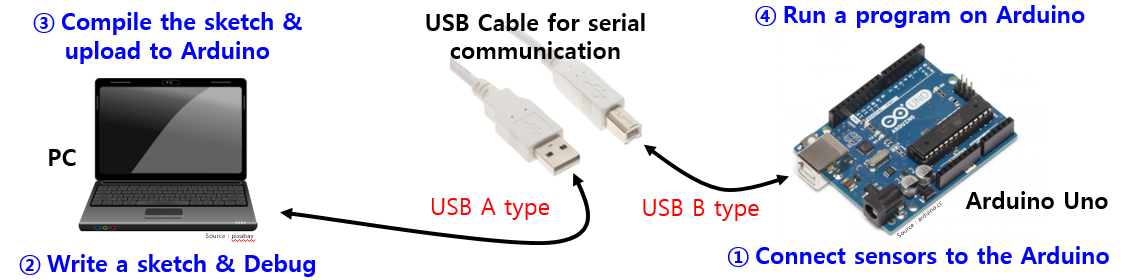 아두이노가 동작하는 메커니즘을 간단히 살펴보자면, 먼저 아두이노 보드와 PC를 USB 케이블로 연결해줍니다. 이것은 보드와 PC 사이의 시리얼 통신을 위한 작업입니다. USB A 타입은 PC에, USB B 타입은 아두이노 보드에 연결합니다. 이제, 센서들을 아두이노 보드에 연결합니다. 그리고 PC에서 스케치를 작성합니다. 스케치를 컴파일하고 보드에 업로드를 합니다. 아두이노 보드 위에서 프로그램이 실행되면, 각종 센서들이 데이터를 수집해서 PC로 전송하게 됩니다.