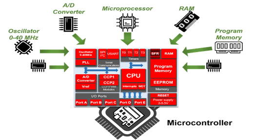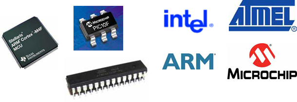 아두이노 보드의 핵심 구성요소는 마이크로 컨트롤러입니다. 그렇다면, 마이크로 컨트롤러란 무엇일까요? 아주 작은 하나의 칩에 작은 컴퓨터가 들어있다고 생각하시면 됩니다. 왼쪽 아래 그림과 같이 그 안에는 마이크로 프로세서도 들어있고, 기억장치인 메모리(RAM, ROM, 플래시 메모리 등)도 들어있고, 여러 가지 입출력 포트들도 포함되어 있습니다. 주로 디바이스 안에 내장되어서 디바이스를 컨트롤합니다. 우리 주변에 스마트 폰, 장난감, 가전제품, 자동차, 카메라 등 많은 영역에 사용되고 있습니다. 인텔, ARM, ATMEL, 삼성 등 다양한 회사들이 마이크로 컨트롤러를 생산하고 있습니다.