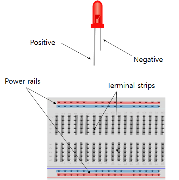 마지막으로 브레드보드가 필요합니다. 브레드보드는 power rails와 Terminal strips로 구성되어 있습니다. 각각의 power rail은 수평하게 내부적으로 연결되어 있습니다. 반대로 각각의 terminal strip은 내부적으로 수직으로 연결되어 있습니다.