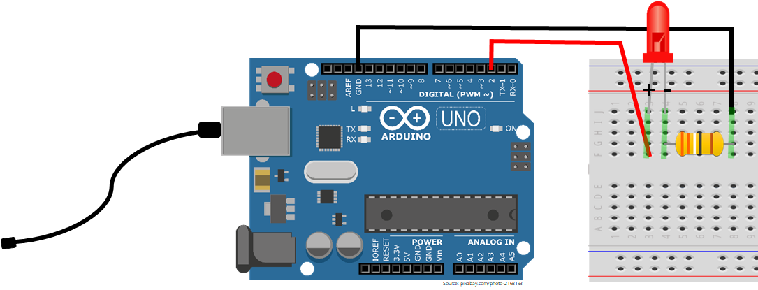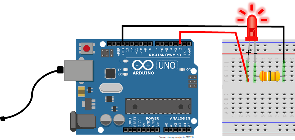 이번 글의 두 번째 실습은 외장 LED를 컨트롤 하는 실습입니다. 아두이노를 사용하는 목적은 외부에 있는 LED 또는 모터와 같은 액츄에이터를 컨트롤하는 것입니다. 그래서 이번 실습부터는 몇몇 준비물들이 필요합니다. 이번 실습에서 점퍼 케이블 2개가 필요하겠습니다. 한 개는 아두이노 보드에서 2번 디지털 핀과 브레드보드를 연결할 것이고, 나머지 한 개는 브레드보드와 아두이노 보드의 Ground(GND)를 연결할 것입니다.
