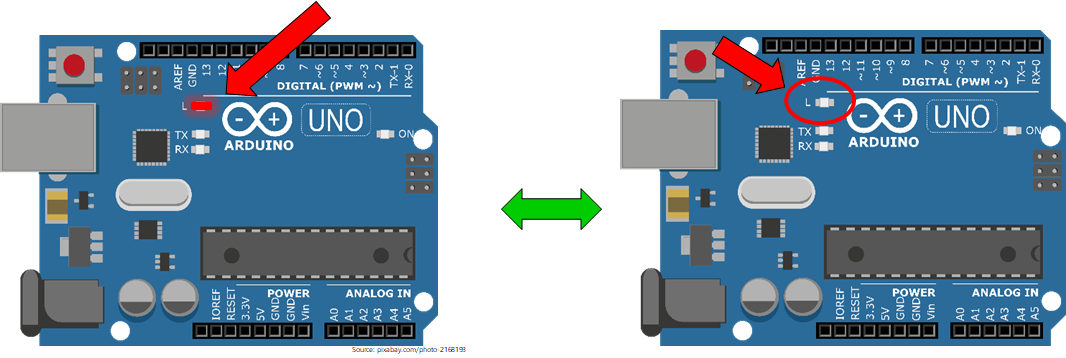 자, 이제 스케치를 업로드 합니다. 업로드 완료라는 글씨가 IDE에 나오는 동시에 보드에 있는 LED가 1초에 한 번씩 깜박거리는 것을 볼 수 있습니다. 정지시키는 방법은 몇 가지 있는데 지금은 그냥 USB 선을 뽑으면 됩니다. 한번 업로드 된 스케치는 새로운 스케치를 업로드 하기까지는 영원히 MCU에 저장되어 있어 언제든지 전원만 공급하면 LED를 깜박거리게 합니다.