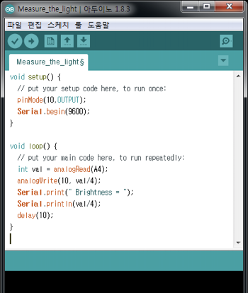 스케치를 작성해보겠습니다. Setup 함수에서 10번 디지털 핀을 OUTPUT모드로 설정합니다. LED에 빛을 켜고 조절하는 역할을 10번 디지털 핀에서 하게끔 회로를 구성했기 때문입니다. 그리고 Serial.begin 명령을 합니다. 이는 시리얼 통신을 준비하는 단계입니다. 센서가 빛의 양을 측정해서 PC로 데이터를 전송하기 위해서는 시리얼 통신이 필수이기 때문입니다. 9600은 시리얼 통신 속도를 의미합니다.
