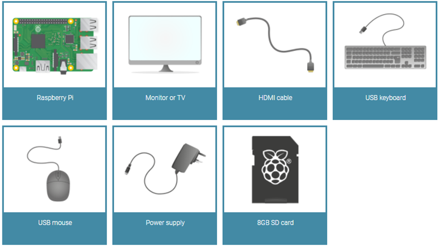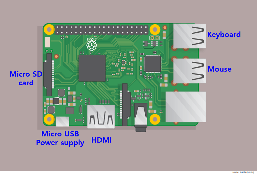 USB 키보드와 USB 마우스를 사용할 수 있습니다. microB USB 전원도 필요합니다. 라즈베리 파이에 운영체제와 데이터를 저장하기 위해서 microSD 카드가 사용됩니다.