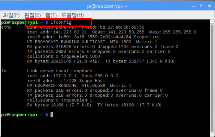 라즈베리 파이에 VNC 서버를 설치해야 합니다. 우선 서버 설치에 필요한 라즈베리 파이의 IP 주소를 확인합니다.
