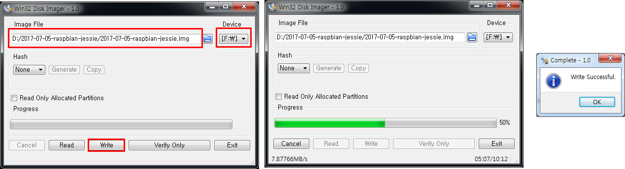 Win32 Disk Imager를 실행 후 미리 다운로드 받은 라즈비안 이미지 파일을 마이크로 SD 카드에 기록합니다.