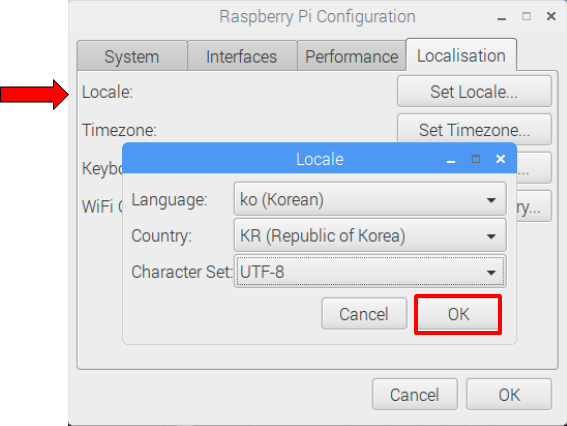 Localisation 탭에서 Set Locale을 누르고, 그림과 같이 한글을 선택한 후 OK 버튼을 누릅니다.