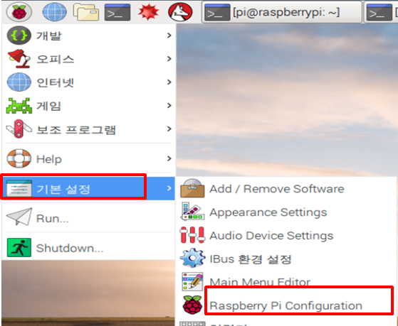 한글 설치가 완료된 후에는 시스템에 반영을 해주어야 합니다. 슬라이드에 표시된데로 Raspberry Pi Configuration을 입력하십시오.