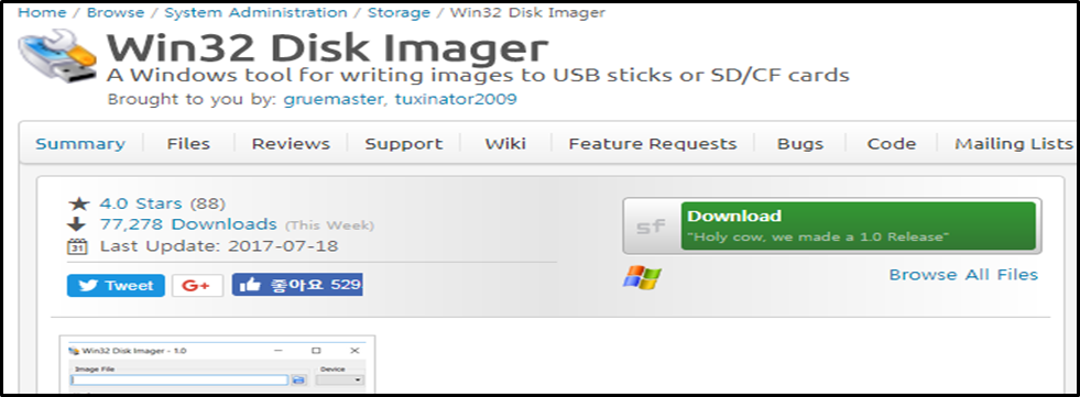 라즈비안 이미지 파일을 마이크로 SD 카드에 넣기 위해서는 툴을 사용해야 합니다. 이 웹사이트에 접속하셔서 Win32 Disk Imager를 다운받아 사용하길 바랍니다.
