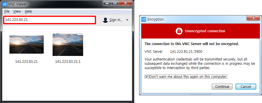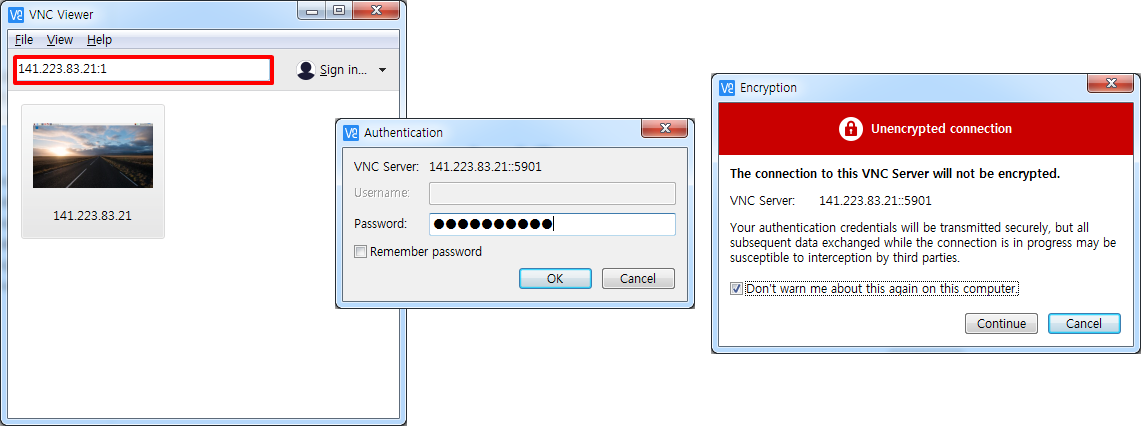 여러분의 PC에서는 VNC 뷰어에 오직 라즈베리 파이 IP주소만 입력합니다. 라즈베리 파이가 오직 하나의 접속만 유지하기 때문입니다. 마찬가지로 보안을 위해 비밀번호를 요구할 수 있습니다.