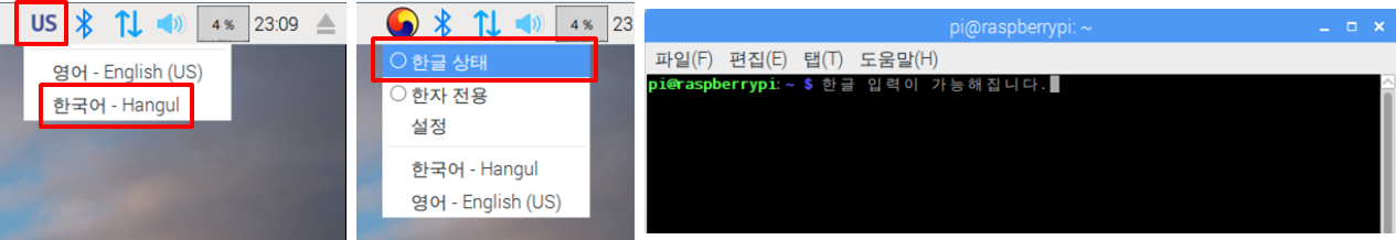 재부팅 후 라즈비안의 모든 영문글자들이 한글로 바뀌었음을 확인할 수 있습니다. 한글 입력을 원하는 경우 메뉴에서 ‘US’대신 ‘한글'을 선택하면 됩니다. 그리고 ‘한글 상태'에 체크를 하게 되면, 앞으로 한글 입력이 가능해 집니다. 다시 영어로 바꾸거나 한글로 돌아올 때는 Shift 와 Spacebar를 함께 눌러 쉽게 변환이 가능합니다.