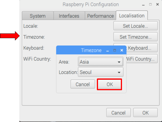 시간 설정도 한국시간으로 해야겠지요. Timezone에서 Area/Location을 Asia/Seoul로 선택합니다.