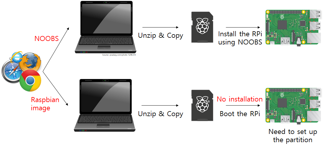 위 그림은 Raspbian을 Raspberry Pi에 설치하는 두 가지 방법을 보여줍니다. 하나는 NOOBS를 사용하고 다른 하나는 Raspbian 이미지를 사용하는 것입니다.