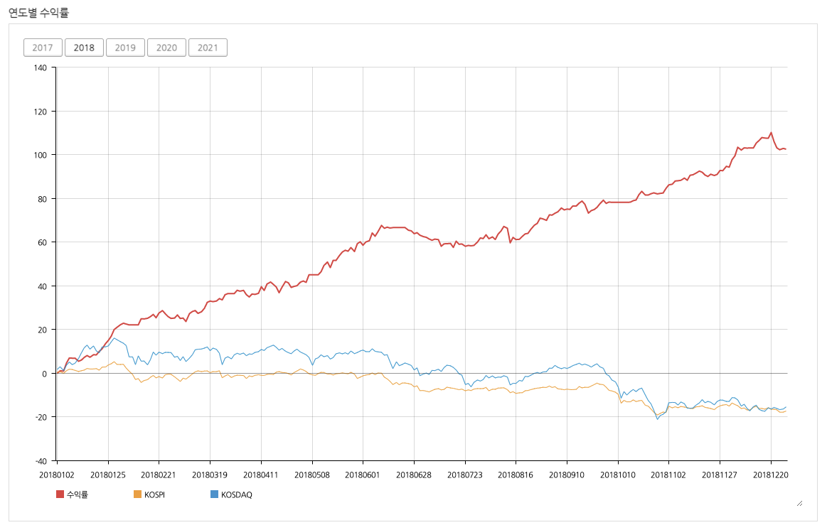 시장이 참 좋지 못했던 2018년에는 약 100%정도를 살짝 넘는 수준의 수익률을 기록했습니다.
