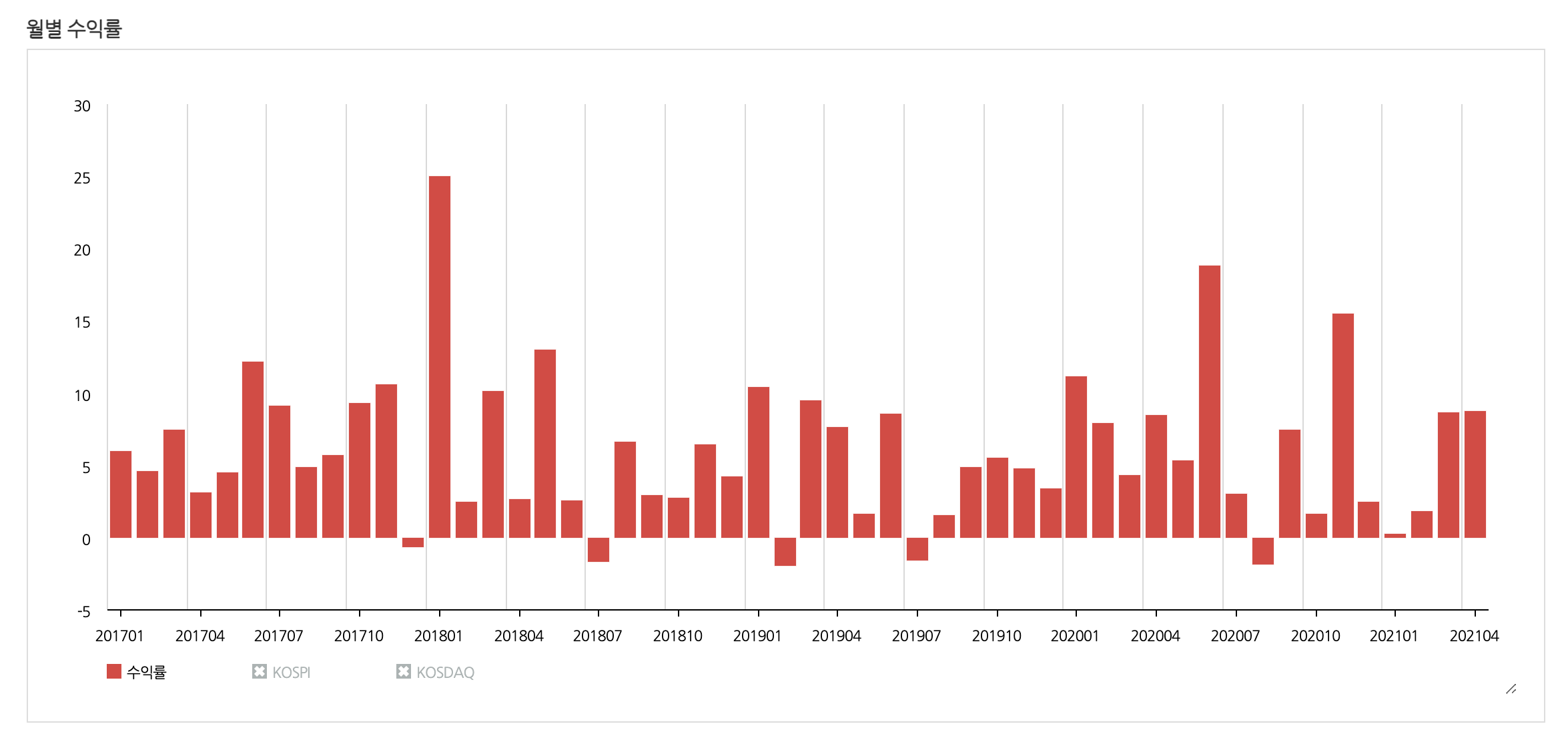 52개월 정도의 기간 중에서 5개월 정도만 마이너스 수익률을 보였네요.