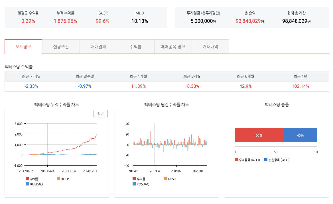 이 전략의 백테스트 결과는 아래와 같습니다. (젠포트 이용)