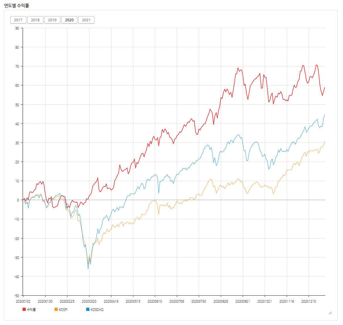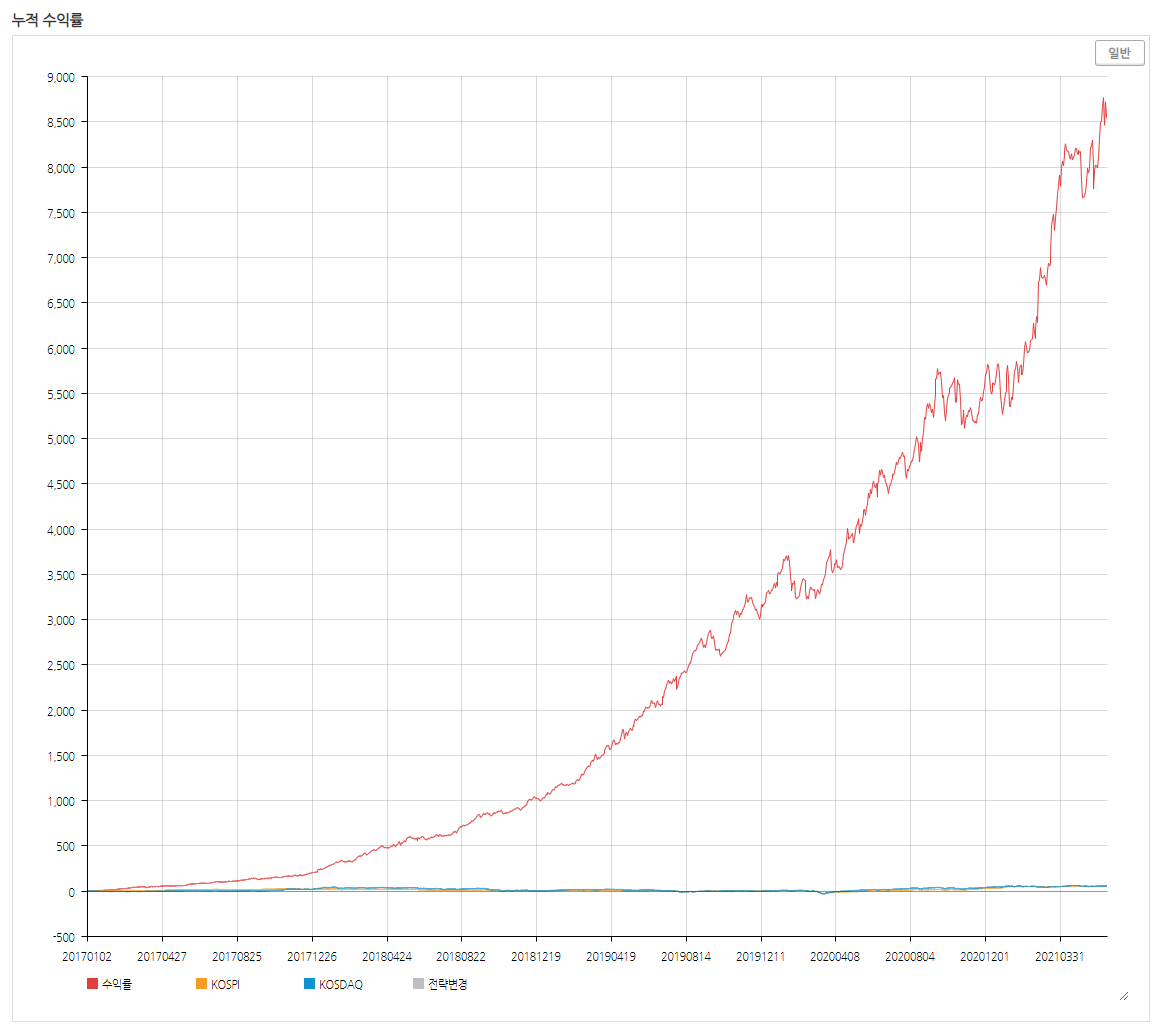 마켓타이밍 조건을 넣지 않아서 연초와 연말의 시장상황에 영향을 받아 지난 3년처럼의 엄청난 수익률을 보여주지는 못했지만 코스피, 코스닥 시장보다 높은 수익률을 기록했고 꾸준한 우상향의 모습을 유지하고 있습니다.