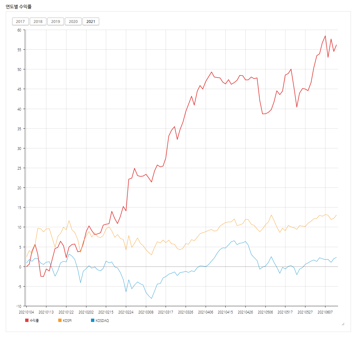 2021년 올해에는 6월 초까지 약 55%의 수익률을 기록하고 있습니다.