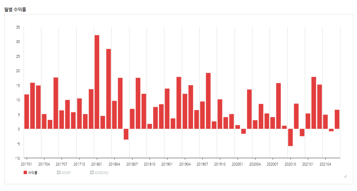 약 54개월의 기간동안 5개월 정도만 마이너스를 기록했습니다.