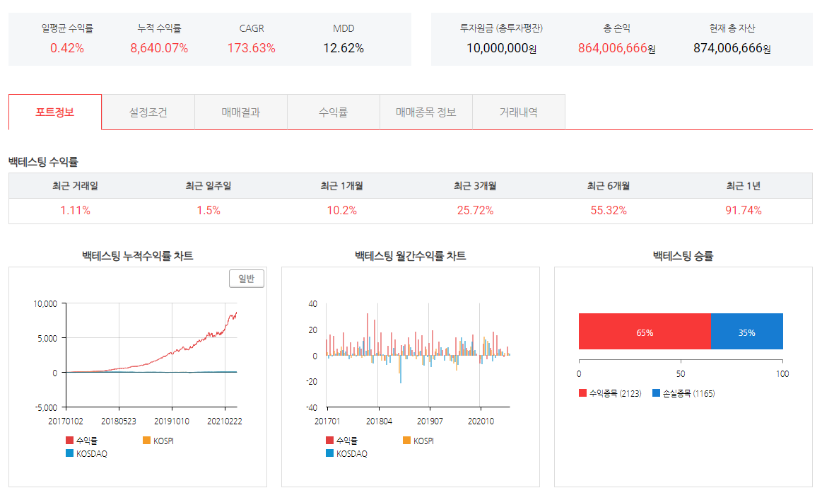 이 기간동안 승률은 약 65% 정도로 훌륭한 성적입니다.