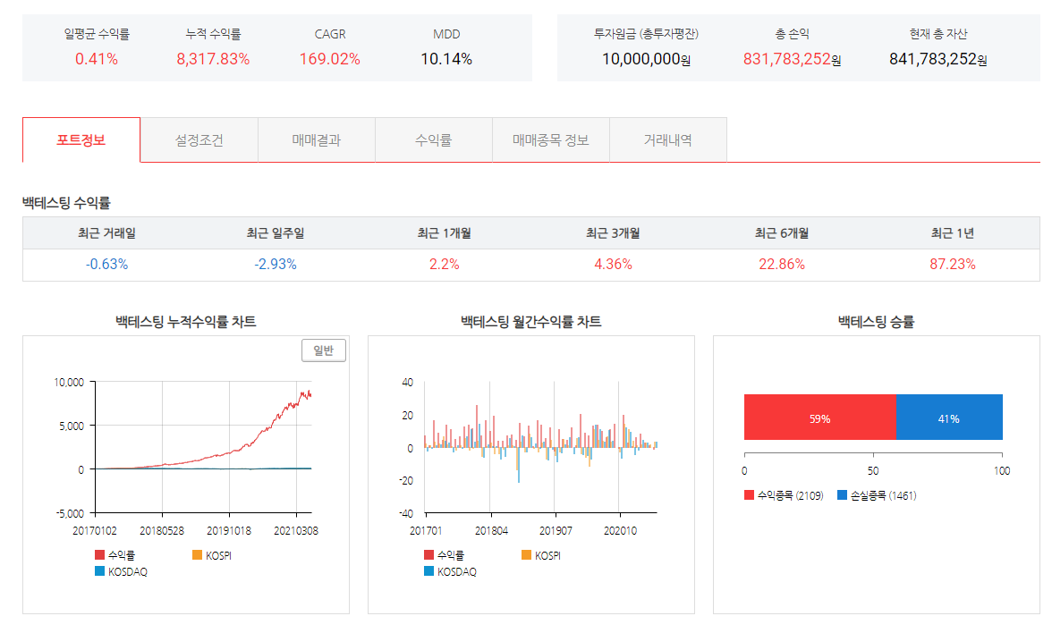 CAGR는 약 169%, MDD는 10% 정도를 기록했습니다. CAGR/MDD 비율이 약 17배 정도 되는데요.