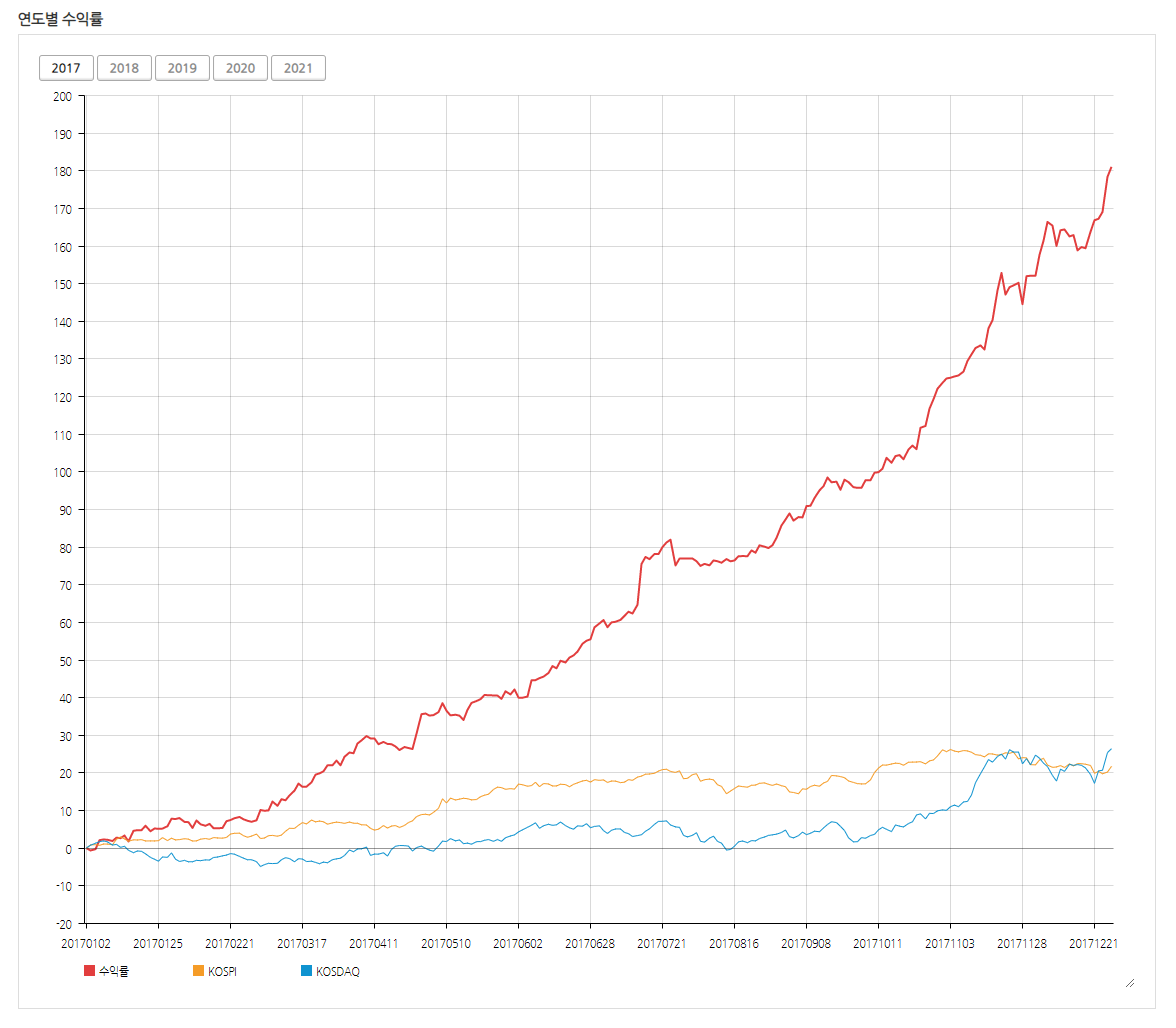 2017년에는 180%정도의 수익률을 기록했습니다. 계단식으로 아주 예쁘게 우상향 하는 모습입니다.