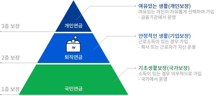개인이 선택적으로 가입하는 개인연금으로 구성된 구조를 3층 보장제도라고 합니다.