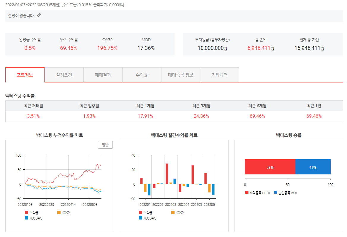 이 전략은 올해 초부터 시작해서 6월말까지 약 70%정도 수익을 기록을 했네요.